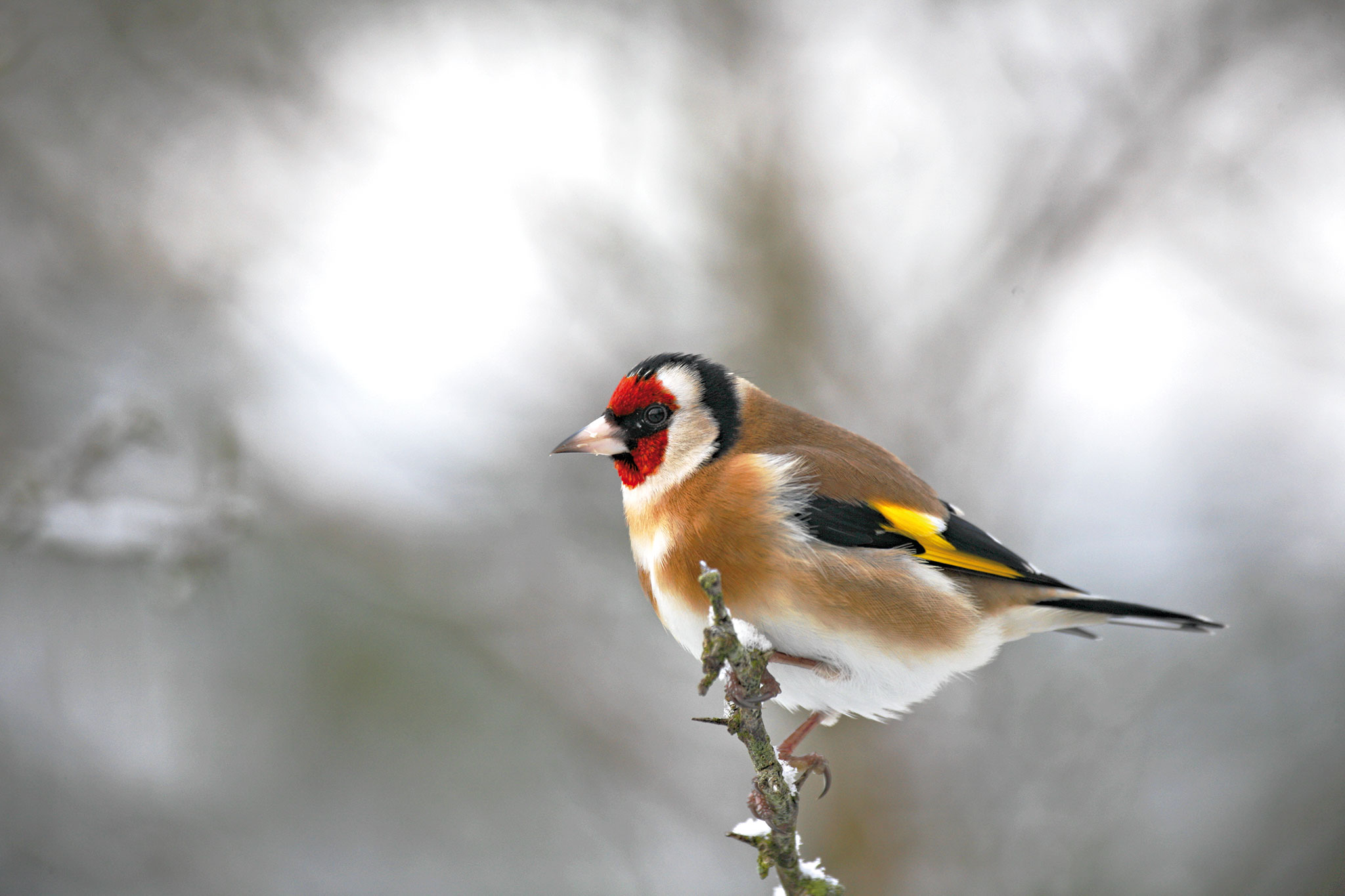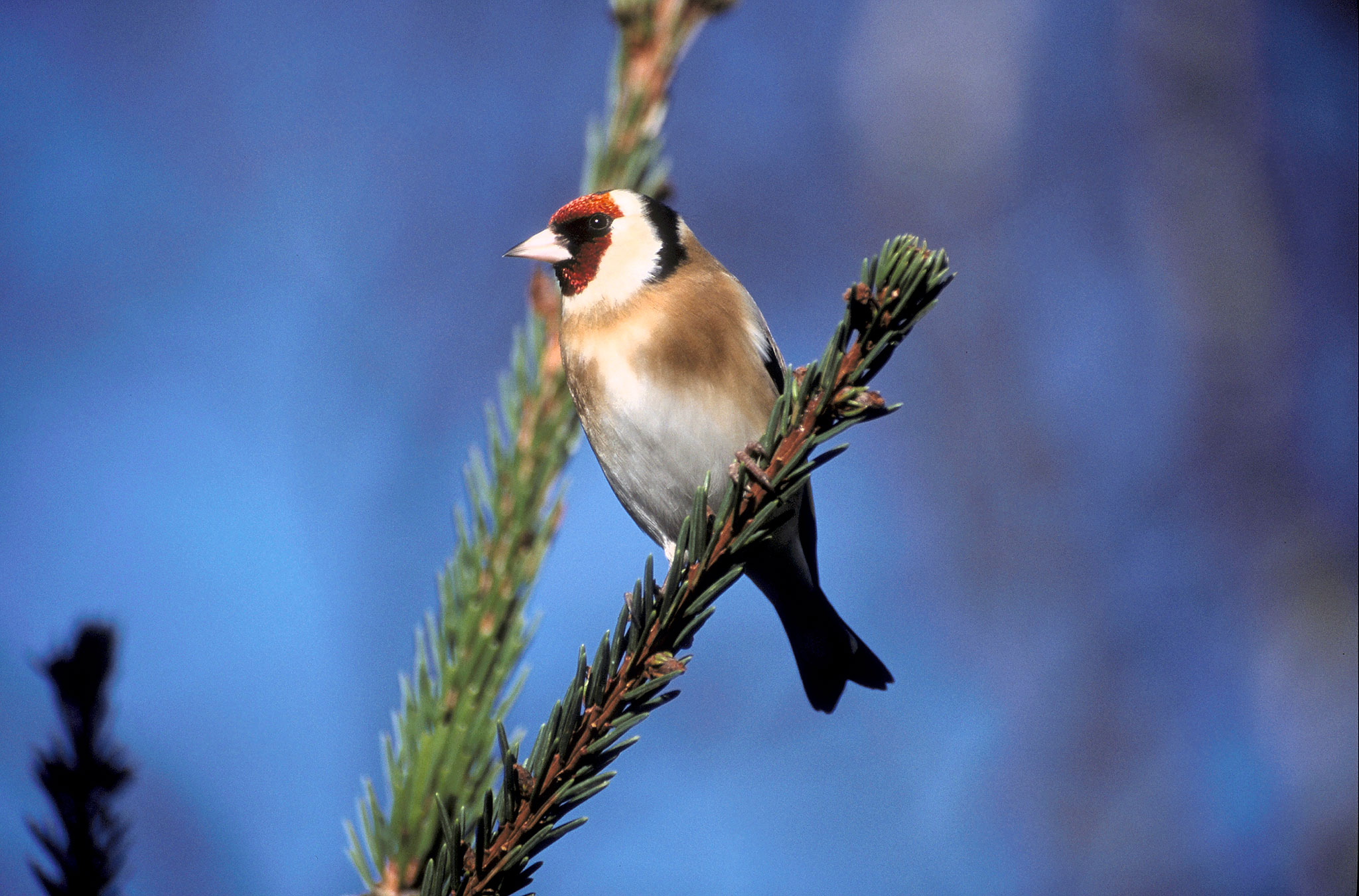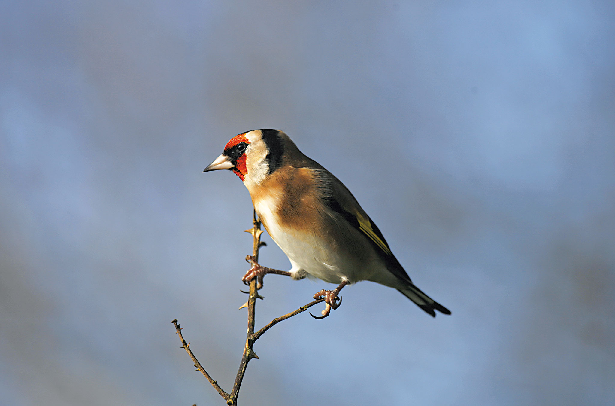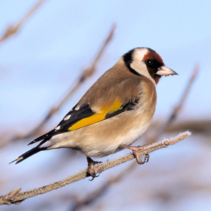 The combination of beautiful colouration and a readiness to visit feeders makes the Goldfinch an enduring favourite with garden birdwatchers. Males and females are almost identical, but if you get good views the red above the eye extends behind the eye in males, and the black on the head and wings is usually more pronounced, without brown or buff edges to the feathers. Both birds make the delightful, tinkling call, but the males are the principal singers.